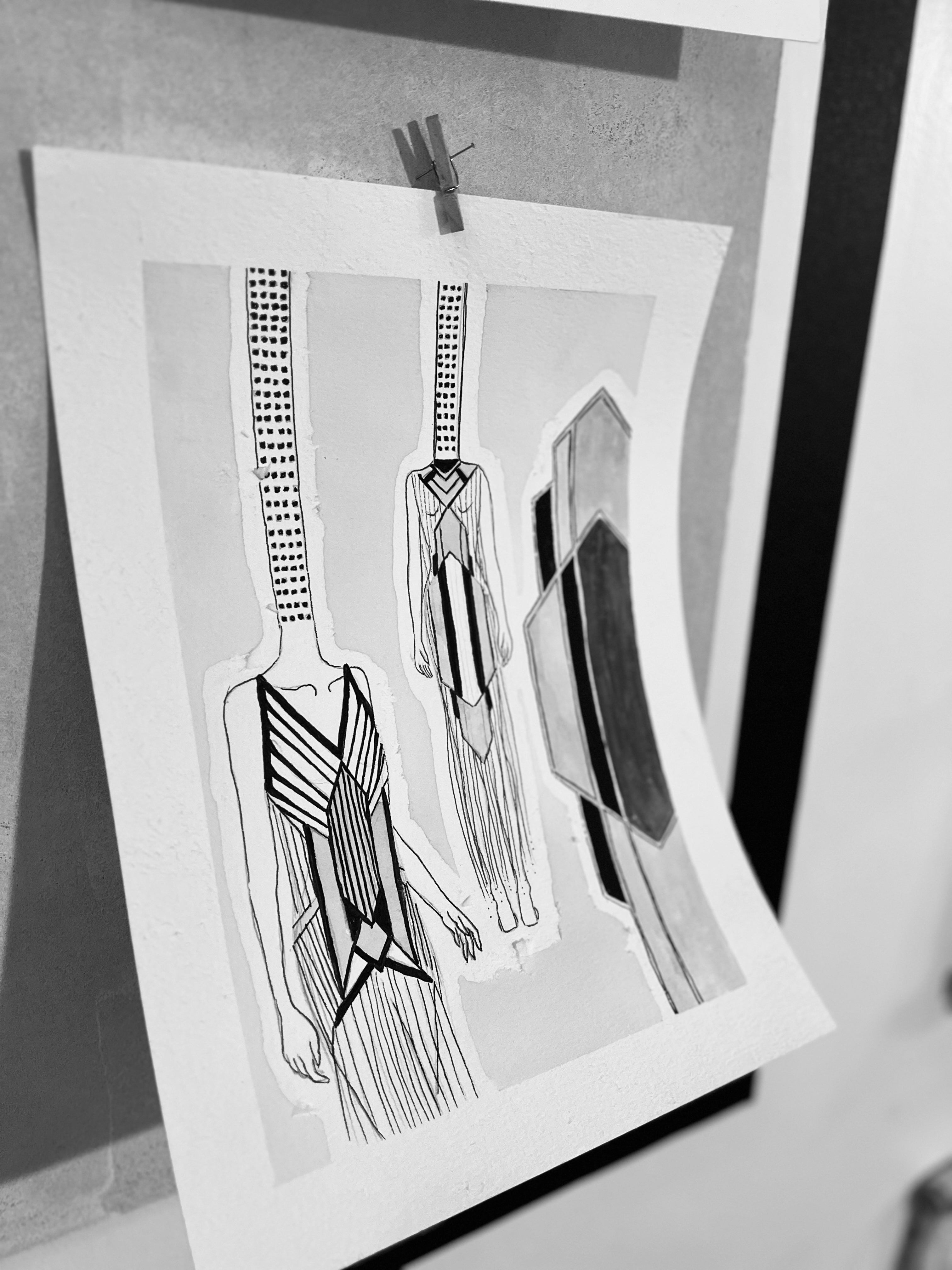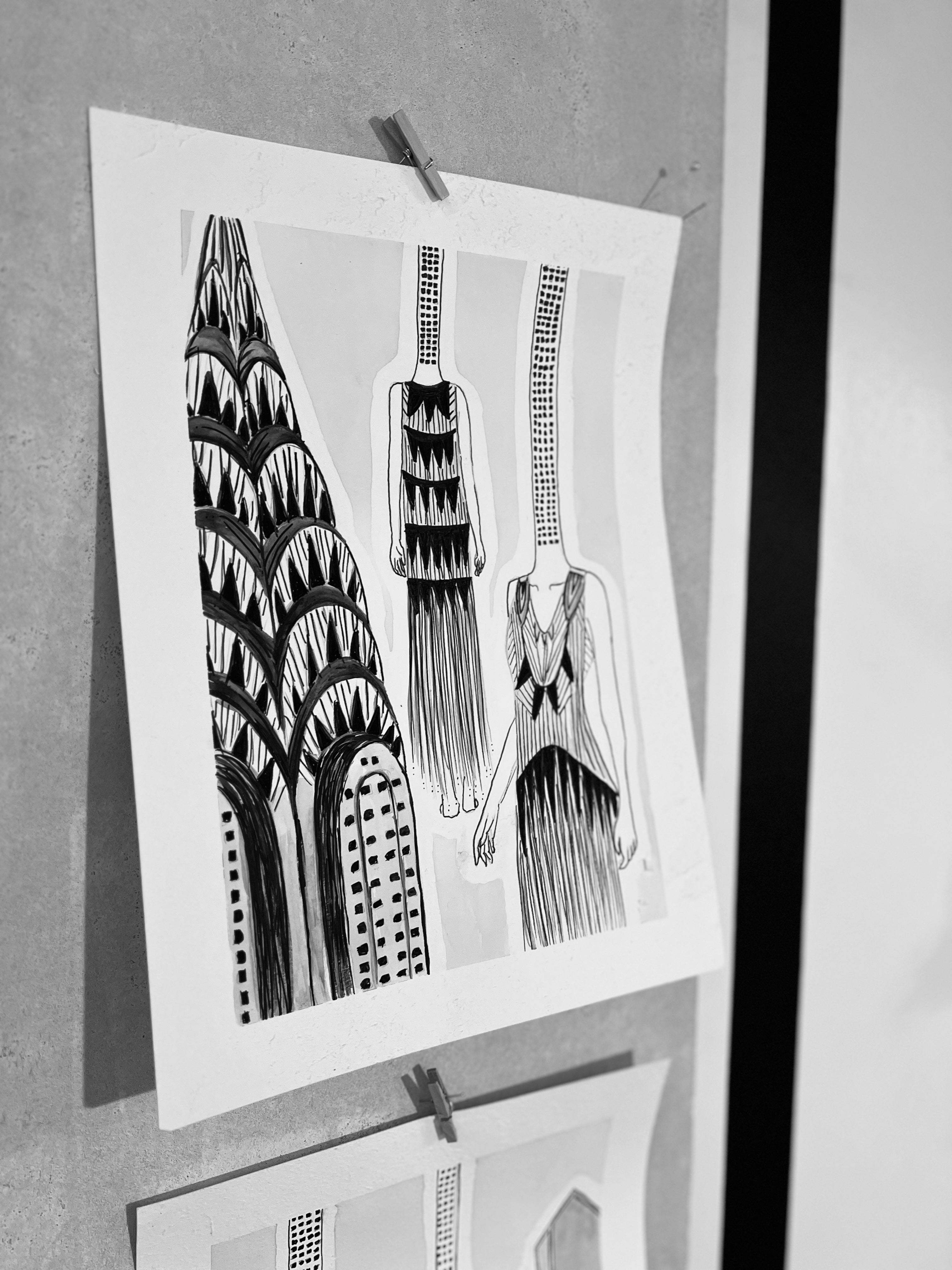 Inspired by the Empire State Building and the Chrysler Building, these two dresses reinterpret Art Deco architecture through 1920s flapper style silhouettes. The designs reflect the bold lines, symmetry and ambition of the era.
