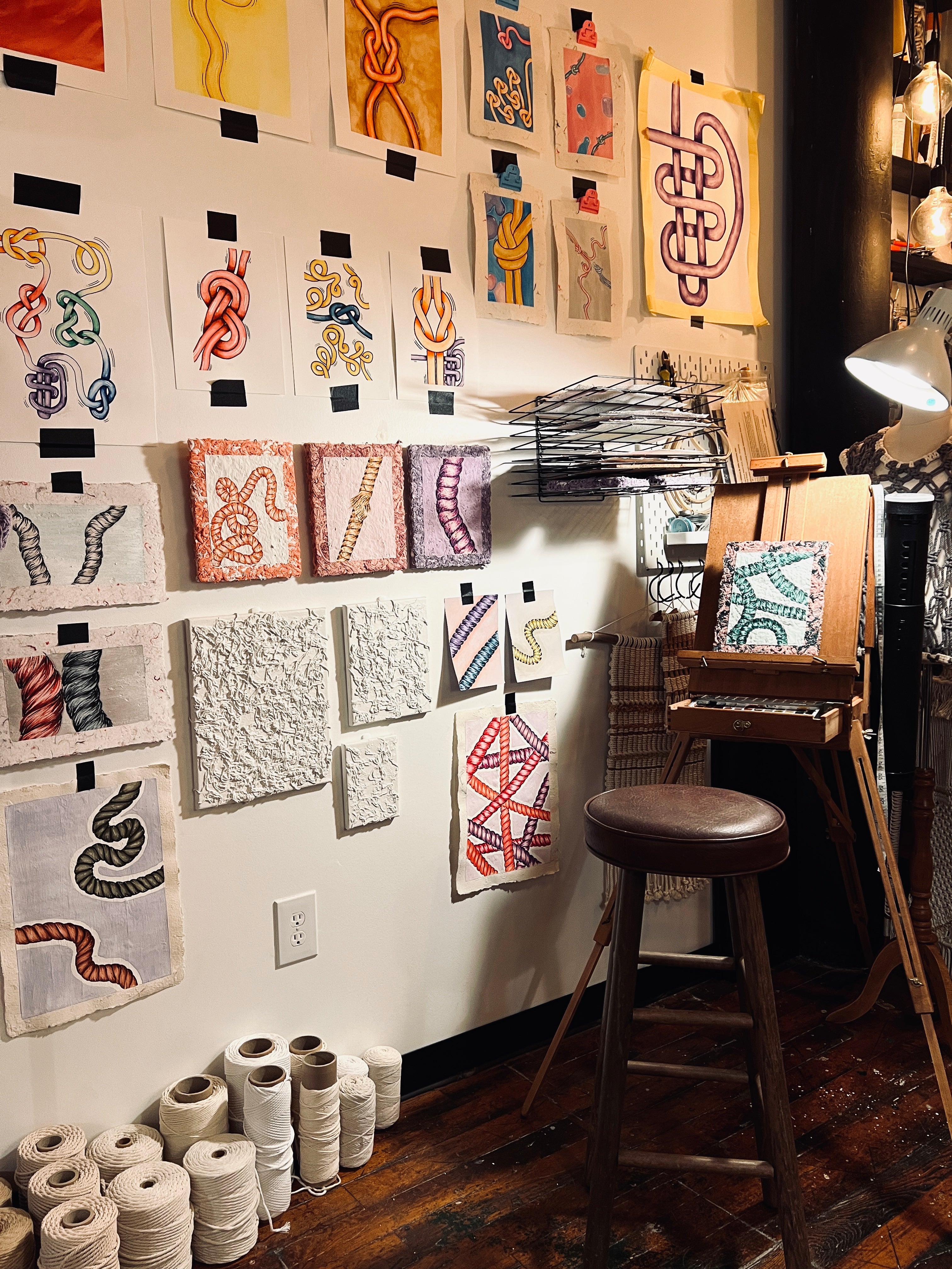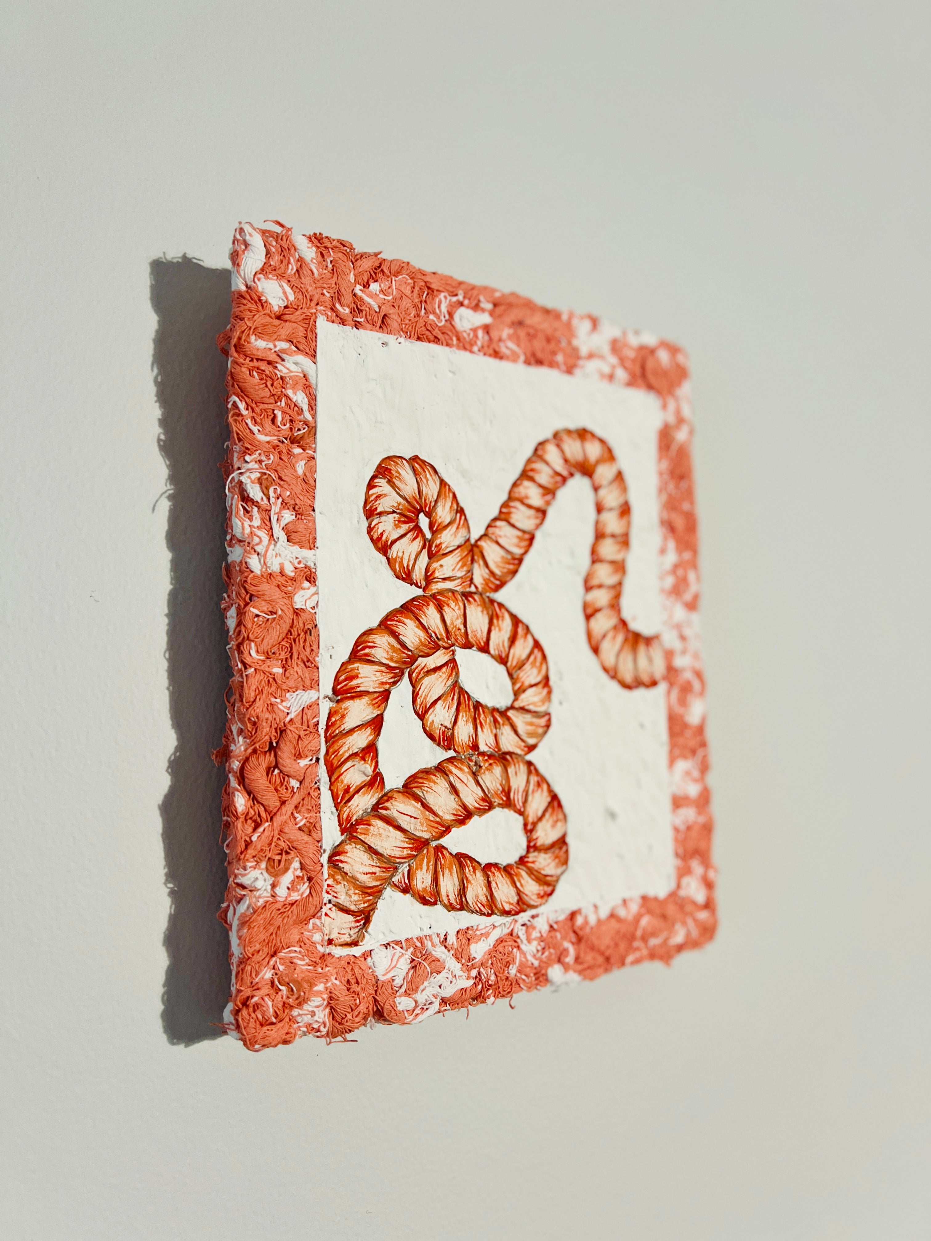 An exploration of materiality, sustainability and the enduring craft of macramé. This series takes discarded macrame cords and transforms them into handmade, recycled canvas. The water-color paintings depict intricate knots and rope forms as a study of their beauty and structure in 2D form.
