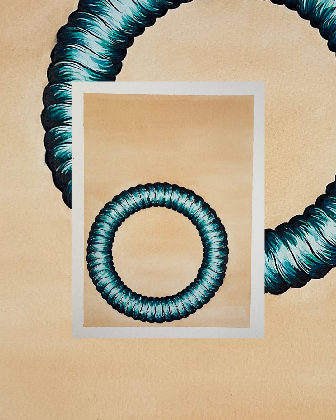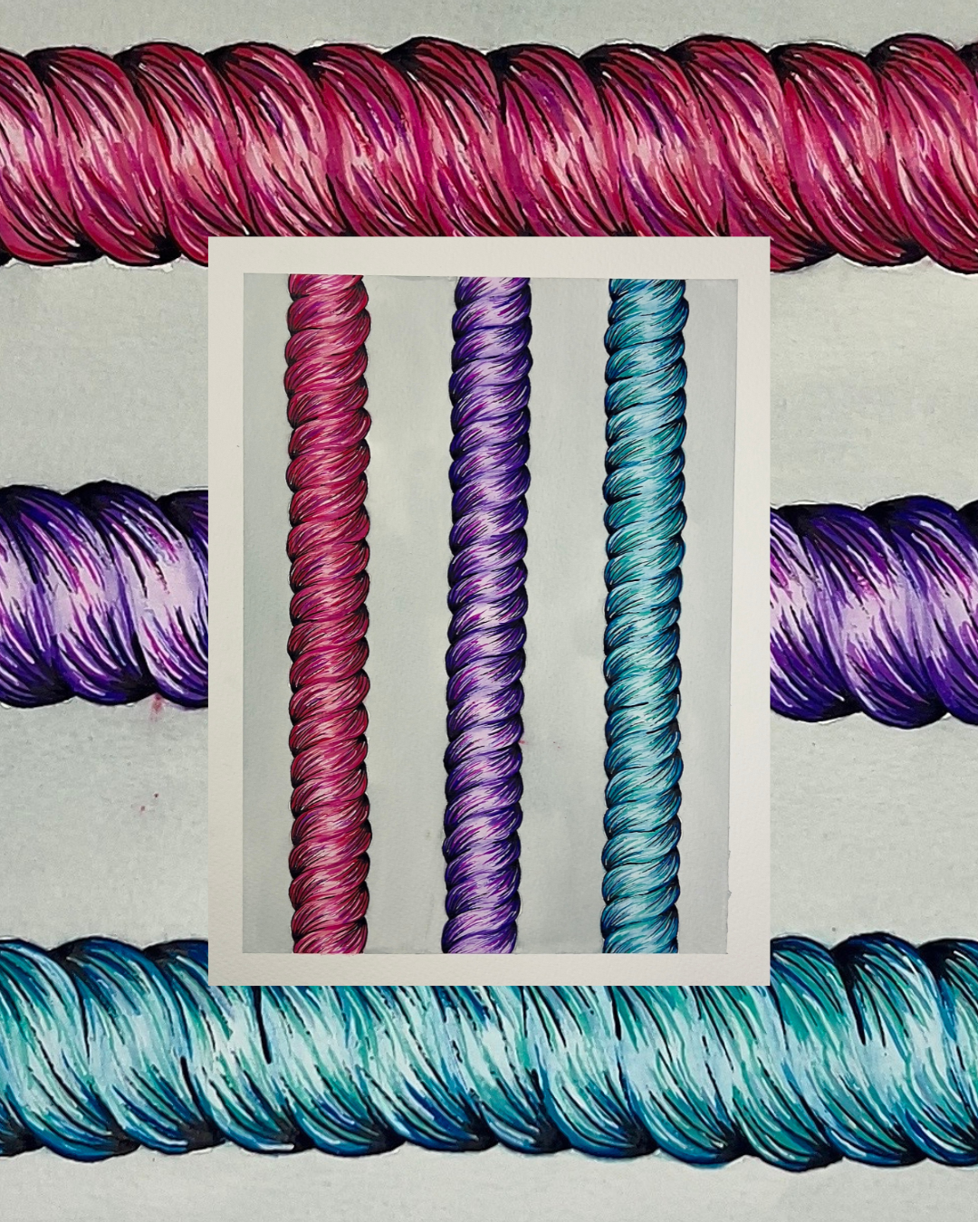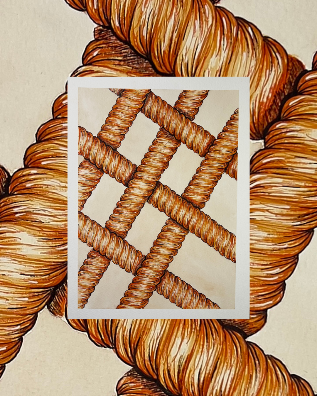 'Tied Narratives' explores the stories we accumulate through life - the moments, connections and tensions that shape who we are. Each knot becomes a metaphor of experience: sometimes tight and tangled, other times open and fluid. The ropes trace narratives of memory and emotion, capturing how our lives intertwine, unravel or re-form overtime. Through this series the act of tying becomes language - a way to translate the complexity of human experience into material form.