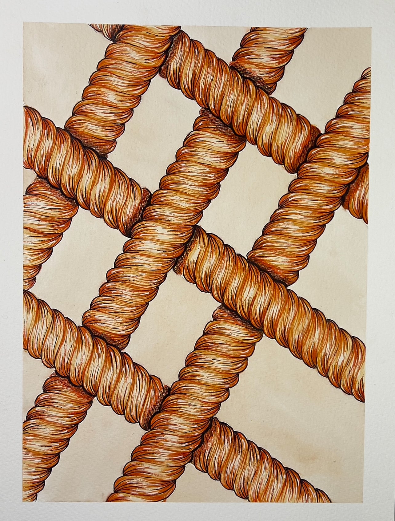 Series - 'Tied Narratives' explores the stories we accumulate through life - the moments, connections and tensions that shape who we are. Each knot becomes a metaphor of experience: sometimes tight and tangled, other times open and fluid. The ropes trace narratives of memory and emotion, capturing how our lives intertwine, unravel or re-form overtime. Through this series the act of tying becomes language - a way to translate the complexity of human experience into material form.