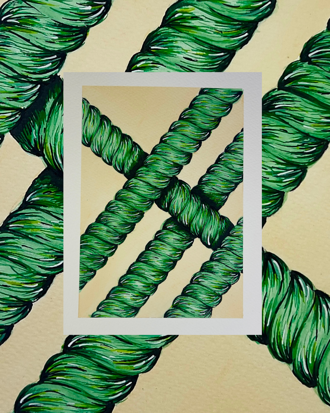 Series - Crosscurrents is a six piece exploration of intersecting forces. Each artwork presents ropes crossing and overlapping, weaving over one another capturing moments of convergence and divergence. The series reflects the unpredictable paths we travel, the relationships we form and the encounters that can alter our direction.