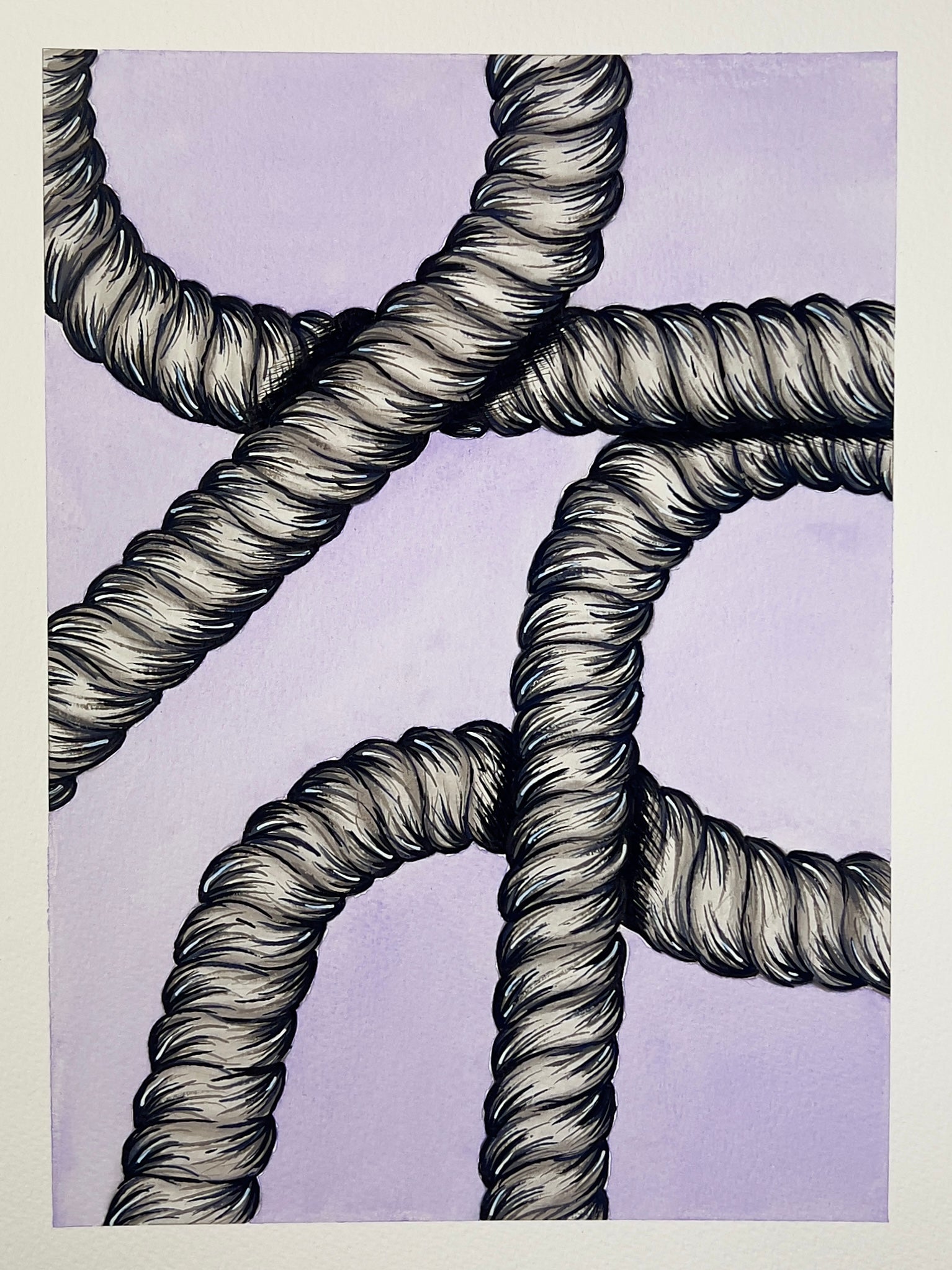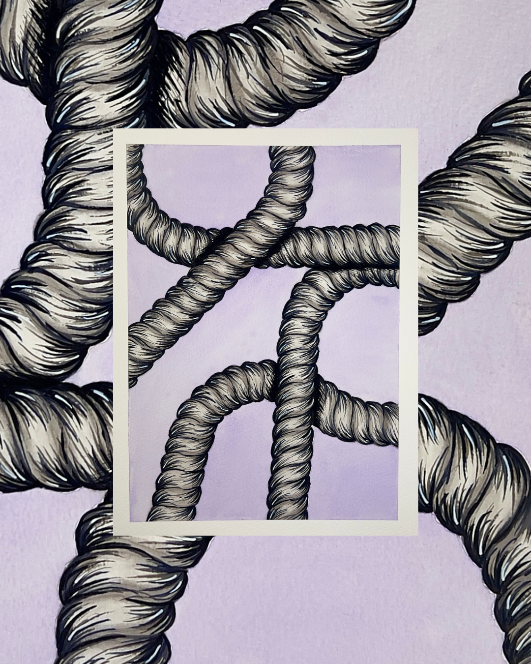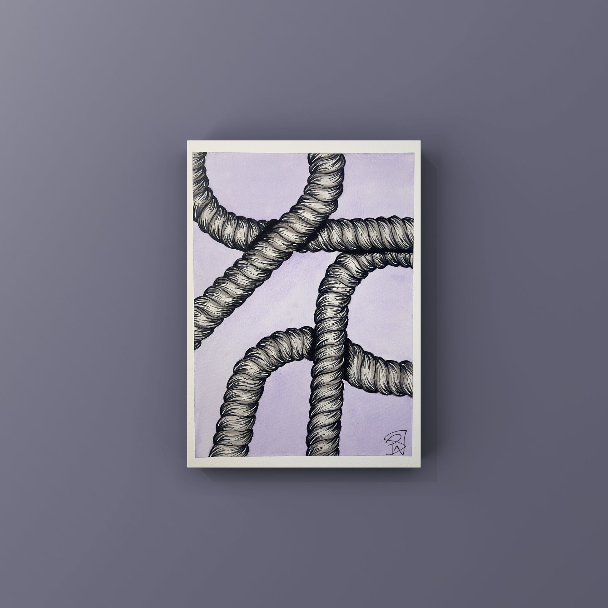 Series - 'Tied Narratives' explores the stories we accumulate through life - the moments, connections and tensions that shape who we are. Each knot becomes a metaphor of experience: sometimes tight and tangled, other times open and fluid. The ropes trace narratives of memory and emotion, capturing how our lives intertwine, unravel or re-form overtime. Through this series the act of tying becomes language - a way to translate the complexity of human experience into material form.